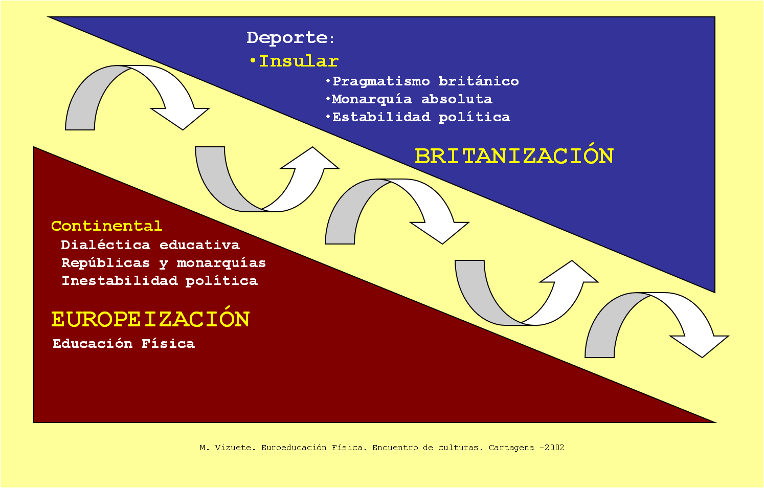 La educación física, desde su realidad continental, es un principio educativo coparticipado por diferentes culturas europeas en las que la estabilidad política y la orientación educativa única, no es precisamente su valor más destacado; sin  temor a equivocarnos, podemos asegurar que la educación física es hija de las mil crisis sociales y políticas que sacuden a la Europa continental desde finales del siglo XIX, hasta casi finales del siglo XX. Influencias culturales de todo tipo, modelos educativos diversos, religiones diferentes, guerras y enfrentamientos sociales, han sido el catalizador de una forma de entender la educación del cuerpo que pasando por escuelas y movimientos diferentes, a través de Europa, han cristalizado en las diferentes corrientes existentes en la actualidad y que, fiel a sus tradiciones, mantiene como objetivo a la salud y a la calidad de vida como horizonte.