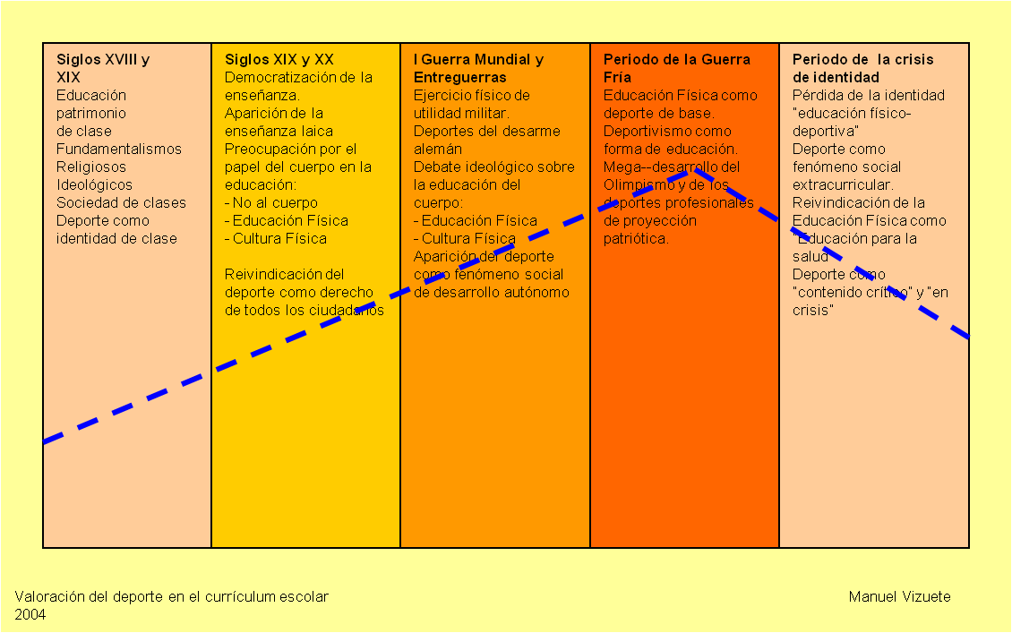 El diagrama nos muestra como el crecimiento del deporte, en su valoración curricular, ha tenido una correspondencia inmediata con los hechos históricos relacionados con la utilidad militar del ejercicio y con los procesos democratizadores de la enseñanza, y como, en la actualidad, la fuerte reorientación del valor social del fenómeno y la pérdida del interés político por el deporte, comienzan a provocar una caída en pico, cuyo remonte va a depender de los nuevos intereses sociales y educativos sobre el deporte relacionados con la aparición de nuevas enfermedades cuyo origen es el sedentarismo y la pérdida del interés social y familiar por la práctica de actividades físico-deportivas de la infancia.[3]