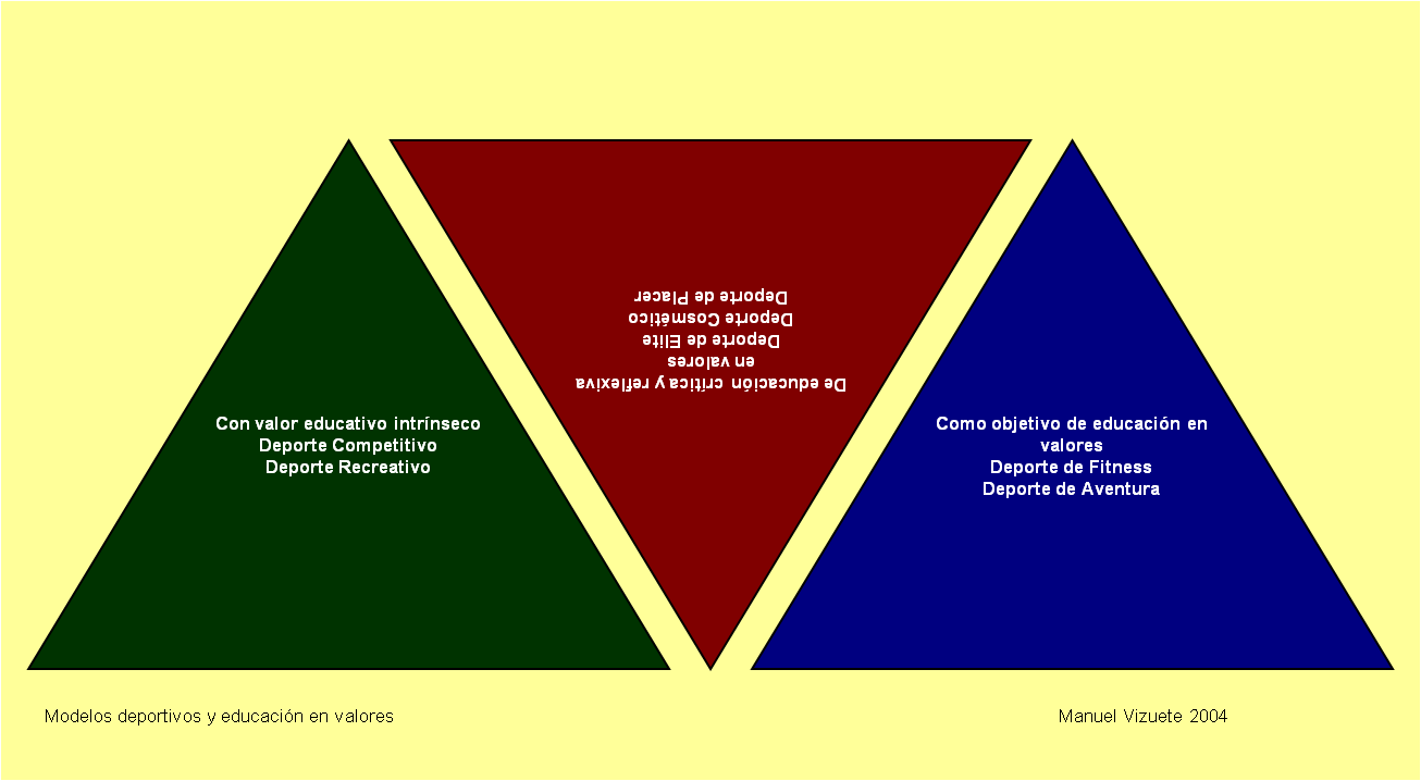 El diagrama pretende representar las situaciones de equilibrio, en cuanto a la educación en valores, atribuibles a cada uno de los modelos. La cuestión es esencial para entender cual ha de ser la posición educativa frente a cada uno de los modelos deportivos que, a menudo, se presentan con poca nitidez y sobre los que debería realizarse una eficaz acción educativa claramente diferenciada y fundamentada en cuanto objetivos y contenidos.