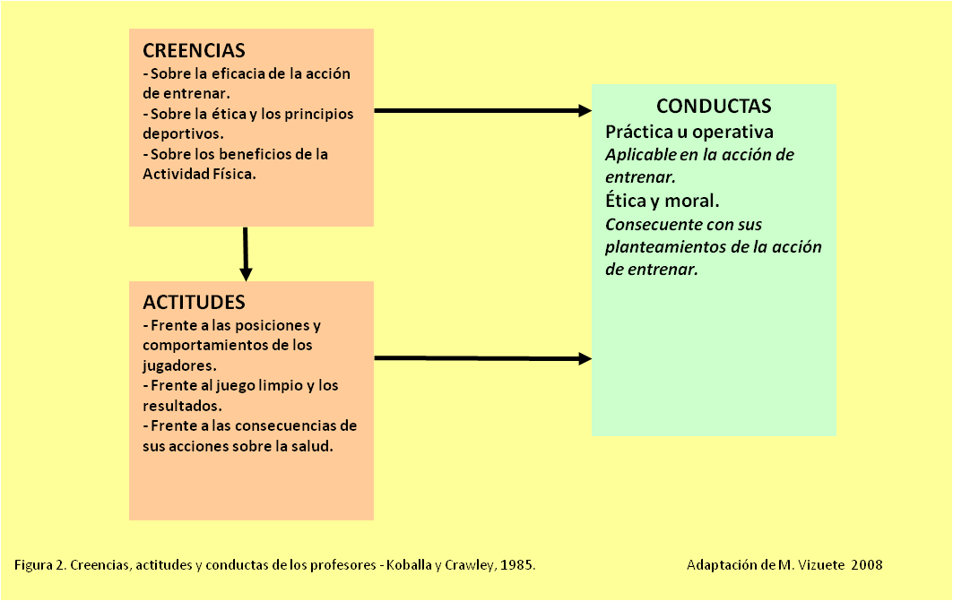Otros autores inciden en que los profesores y entrenadores, en nuestro caso, tienen conocimientos, pero también creencias y actitudes, que influyen en toda su actividad profesional. Algunos no hacen distinción entre creencias y actitudes y a ambos se le asigna un componente afectivo;[7] sin embargo, hemos de estar de acuerdo[8] en que las actitudes están más relacionadas con un sentimiento general hacia algo ya sea positivo o negativo, que llevan marcadas unas tomas de posición y que están más directamente relacionadas con las acciones de enseñanza, de tal manera que las creencias influyen en las actitudes y ambas en la conducta del entrenador: