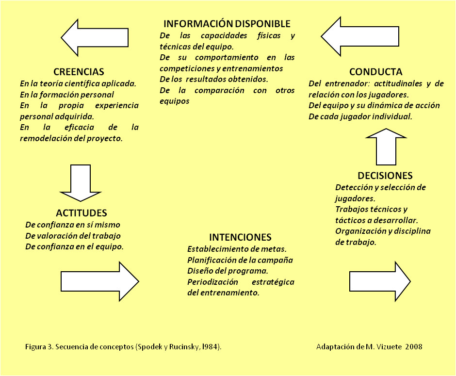 Un entrenador con experiencia, construye un modelo mental coherente entre sus creencias sobre la enseñanza y el aprendizaje del deporte y de los gestos deportivos de tipo tradicional, y su conducta en el aula. Este modelo es muy estable porque hay congruencia no sólo con las creencias del entrenador, sino también con sus objetivos, y con las creencias y las acciones de los deportistas construidas en el contexto de la sesión de entrenamiento.