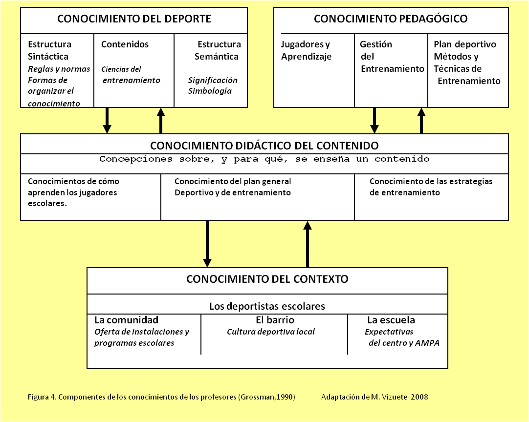 Una aportación fundamental para la determinación del conocimiento profesional del entrenador es la de Shulman, cuando hablando de la formación del conocimiento didáctico del contenido expresa[1 …….nuestro proyecto estudia lo que los profesores conocen sobre sus materias, donde y cuando adquieren el conocimiento, como y por qué este conocimiento es transformado durante la enseñanza o la formación de profesores, y cómo es utilizado el conocimiento en la instrucción en el aula (pp. 110).