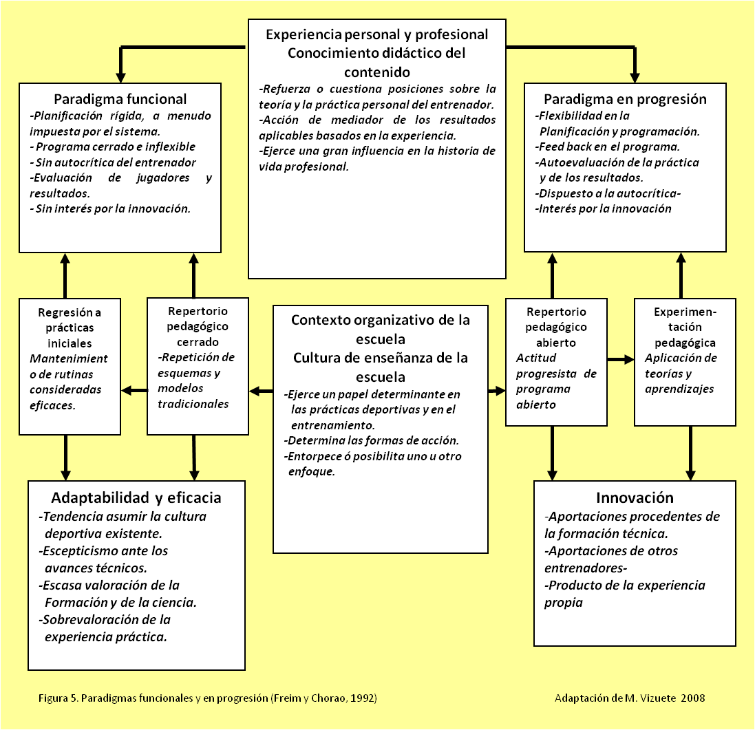 Los profesores de educación física y los entrenadores escolares, por lo general,construyen en el aula modelos instruccionales deactuación guiados por principios prácticos y funcionales. Estos modelos son complejos y polifacéticos, se desarrollan de forma lenta y gradual a través de la experiencia y de un considerable esfuerzo y, a menudo, no se corresponden con las concepciones explícitas y con los conocimientos teóricos.