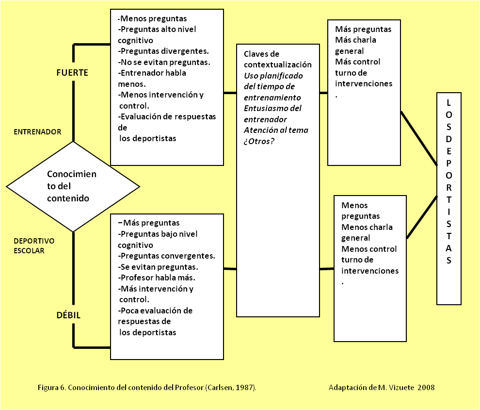 De acuerdo con Carlsen[43]y en relación con los entrenadores deportivos escolares, el conocimiento del contenido influye en las explicaciones y en el discurso en las sesiones de entrenamiento. Indicaría que un mayor conocimiento del contenido hace que los entrenadores hablen menos y en periodos más cortos, realicen menos preguntas pero de más nivel cognitivo, y evalúen mejor las respuestas de los deportistas escolares. Los deportistas de los entrenadores con mayores conocimientos tienen más intervenciones en clase, realizan más preguntas y controlan más sus turnos de intervenciones. (figura 6)