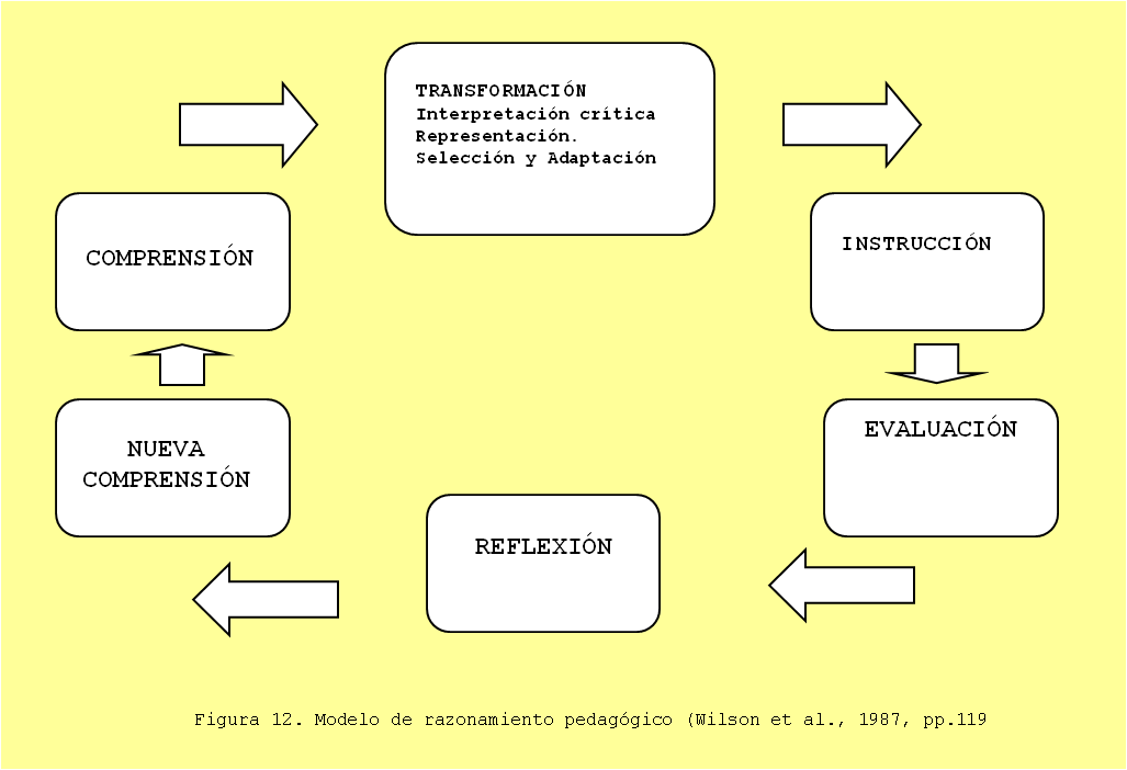 El modelo de razonamiento y acción pedagógica, en el que coinciden varios autores, tiene cinco fases que se suceden de una manera cíclica:[51] conocimiento comprensivo, transformación, instrucción, evaluación, reflexión y nuevo conocimiento comprensivo. (figura 8)