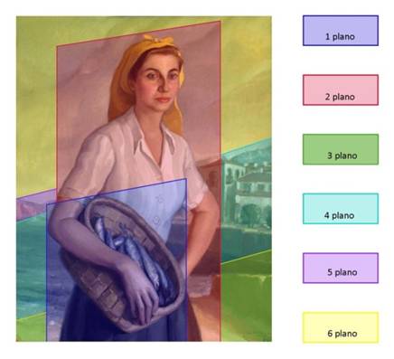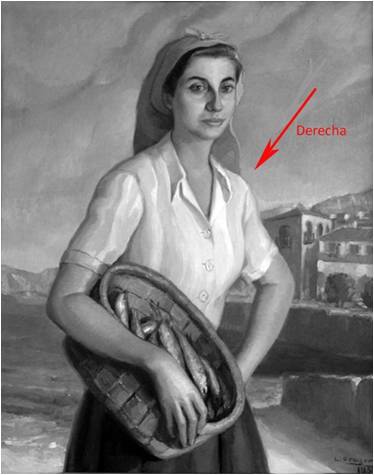 Con respecto al centro, el motivo principal de este cuadro, La pescadora, estaría en el centro levemente desplazada hacia la izquierda = CI. La masa de la figura se encuentra en esta posición. La posición de la cabeza está en el centro y es determinante, pero el cesto cogido con la mano derecha de la figura, en primer plano a la izquierda desvía la posición, que a su vez se compensa con el motivo principal del fondo (las casas) situado a la derecha. Los oscuros más intensos también están a la izquierda cargando sobre ese lado el peso visual. La mirada llena el espacio hacia el centro. El color activo del pañuelo, el amarillo, dirige la mirada ligeramente hacia la derecha. Teniendo en cuenta todas estas tensiones y el predominio de unas sobre otras como el valor, el volumen general o la cabeza se determina la posición.