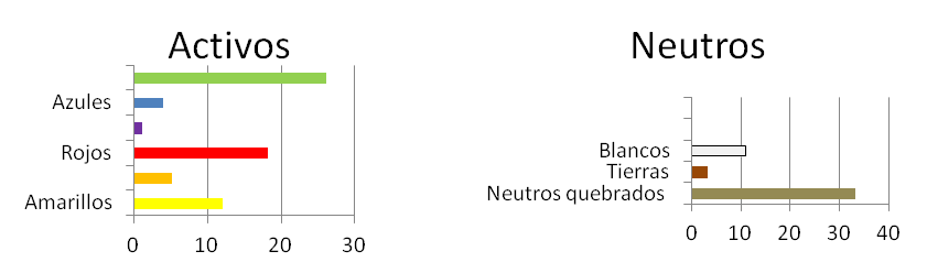 Los colores neutros quebrados aparecen en todos los cuadros (100%), los verdes en 9 (81%), los amarillos en 1 (9%), rojos en 1 (9%), azules en 3 (27%), tierras saturadas en 6 (55%).