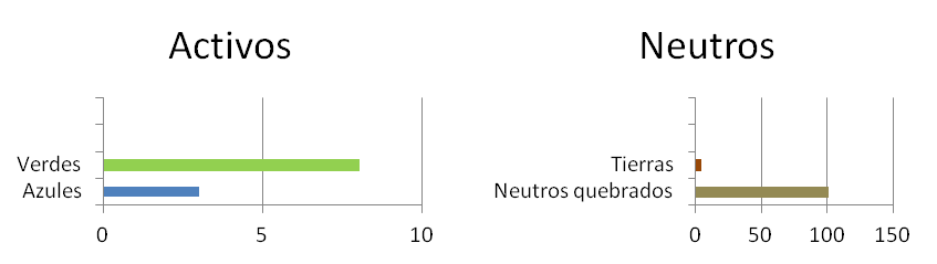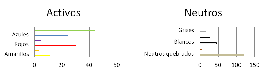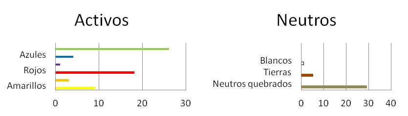 N= colores neutros, tierras y grises. (g)= predominio de los grises. (t)= predominio de las tierras. Los demás son los colores activos que marcan la armonía. Cuando además de los predominantes aparecen otros en menor medida, los primeros están reseñados con una (p).Los blancos, negros y tierras que aparecen además de los N, es porque forman parte de la armonía principal, por grado, saturación o tema. Los rosas se contabilizan como rojos, al igual que los carmines. Azulados, anaranjados, rojizos o verdosos como azules, naranjas, rojos o verdes.