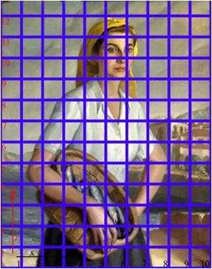 Se ha tomado como invariable una dimensión: el ancho, la cual la hemos dividido en diez partes, y variable el alto en función de la proporción del lienzo, tomando módulos de la misma medida que los utilizados para el ancho. Para lo que se ha aplicado una cuadrícula sobre la imagen de 10 x 16 cuadros, ajuntándola siempre al ancho.