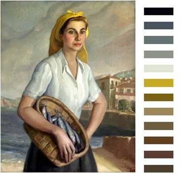 Armonía de color: predominio de tonalidades neutras en tierras y grises quebrados, con tendencia a veces a azulados y verdosos. Como único color activo aparece el amarillo. El blanco y el negro por el tema, la cantidad de superficie ocupada y el grado de saturación, pasan a formar parte de la armonía principal. Los contrastes más destacados de luz y de sombra están concentrados en la figura, destacando su importancia con respecto al fondo.