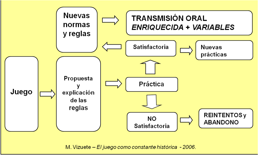 Las formas de transmisión oral son posibles en tanto en cuanto lo que se ha de trasmitir es realmente representativo y, por supuesto, merece la pena ser recordado y trasladado a otros bajo el prisma de la satisfacción –insatisfacción que produce; esto es realmente importante puesto que considerado un juego cualquiera en el tiempo, podemos asegurar que su transmisión está asegurada en tanto en cuanto produce placer y satisface a los que lo practican; de tal manera que la desaparición de un juego cualquiera del horizonte cultural, la muerte en definitiva del juego, se produce cuando este no responde a estas exigencias; en este sentido, habríamos de contar además con el factor de incertidumbre del resultado; toda vez que el hecho de jugar es atractivo si, y solo si, existe una posibilidad cierta de triunfo.