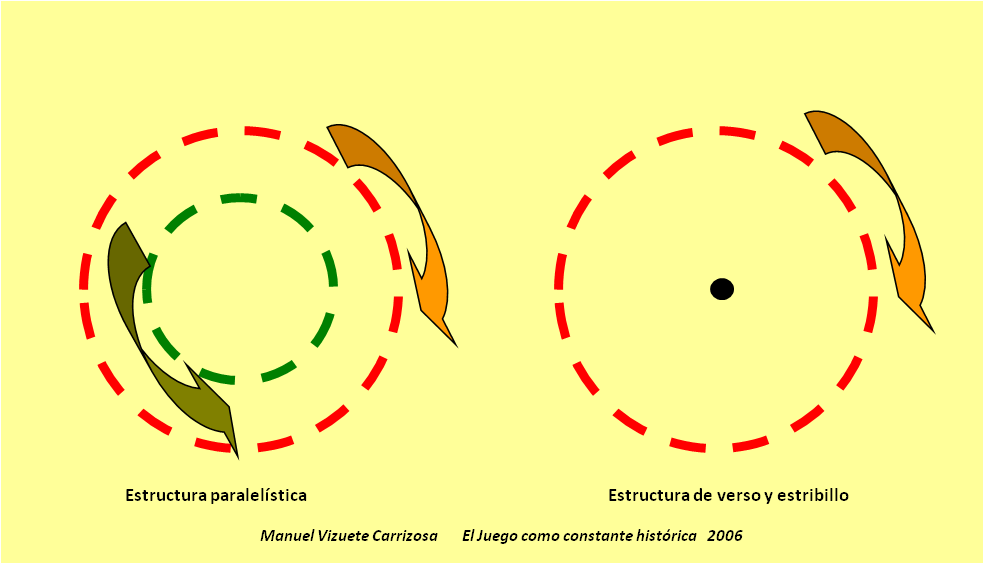 Al hablar de la estructura, y como he sostenido,[4] los juegos poseen una doble estructura interna que los define como tales y les hace evolucionar, por una parte en el tiempo, y por otra en las edades de los jugadores sin que ambas estructuras, interrelacionadas, sufran merma en sus capacidades ya que, en definitiva, el juego no es otra cosa que un cuento escenificado que en cada momento da satisfacción a las necesidades culturales, motrices, éticas o morales de un colectivo social.